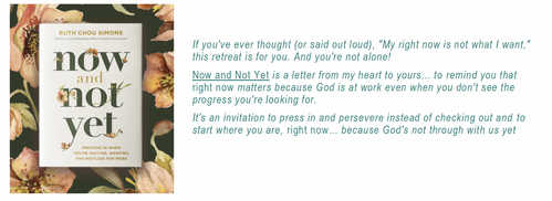 Our simple gathering is going to be intentional about creating space for you to spend with God. Therefore, our teaching will be from Ruth Chou Simons and her book, Now and Not Yet. We will be working through the study guide she created (The study guide is provided as part of your retreat fee.). We will also watch her excellent and practical video teaching on the idea of what it means to live in the now and not yet. We will spend time in smaller groups for reflection and discussion. We will spend some extended personal quiet time with a deep dive into scripture from the study guide that will challenge us as we renew, restore, and reconnect with God.